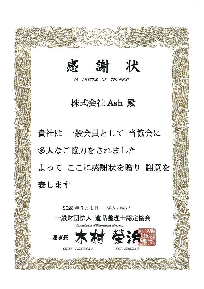 遺品整理士認定協会認定 感謝状