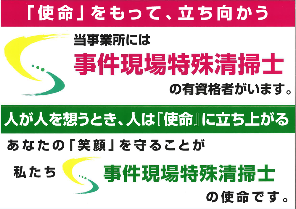 • 私は、子供の頃より「地域の役に立ちたい」「人のためになる仕事に就きたい」と熱望し、特殊清掃や遺品整理の仕事を7年前より従事してまいりました。2社の特殊清掃・遺品整理会社にて、お世話になり、技術や知識を習得し、お客様の役に立つことを一番に「現場」にこだわって立ち続け、現場作業員、責任者、社長として、その立ち位置に変化はありましたが、思いや、見方、目標はずっと変わらずに「お客様の笑顔が見たい」、「困っている人のお役に立ちたい」気持ちを大切に、自身ができることを日々丁寧にこなしていくこと、そしてそれを沢山の人々に丁寧に教えていくことを大切にして行きます。