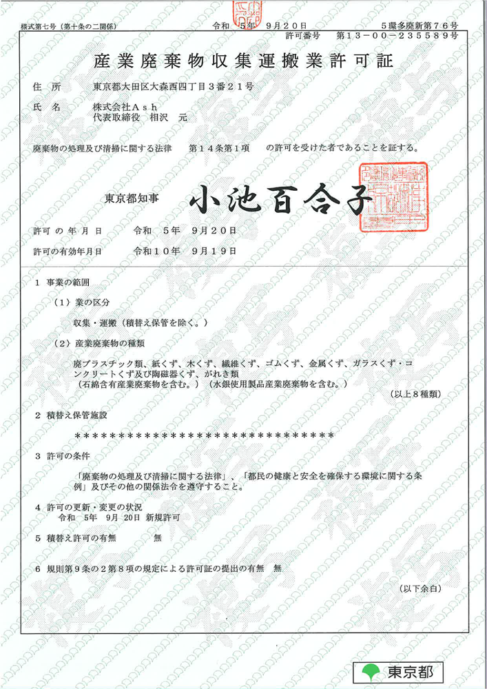 産業廃棄物収集運搬業 許可証(東京都)