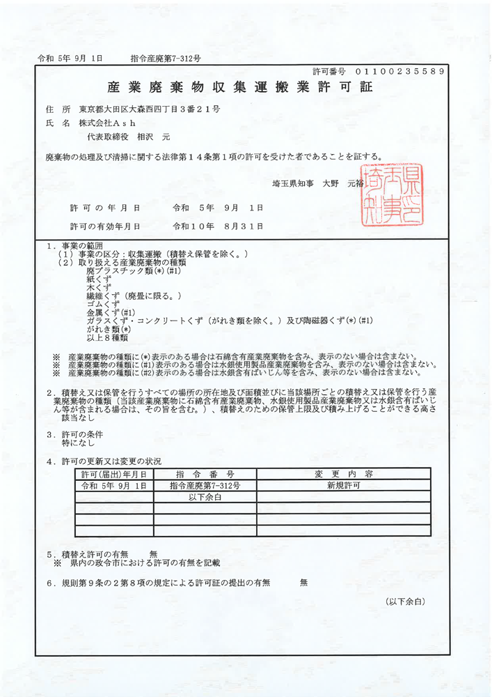 産業廃棄物収集運搬業 許可証(埼玉県)
